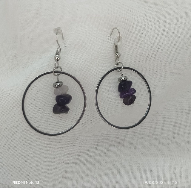 Boucles d'oreilles à crochets et anneau en acier inoxydable et pierres naturelles baroques améthyste.